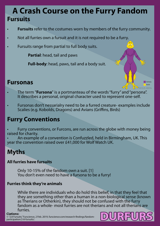 The term furry describes a diverse community of fans, artists, writers, gamers, and more. Most furries create for themselves an anthropomorphized animal character (fursona) with whom they identify and can function as an avatar within the community [1]. The society is a fandom, like anime or Star Wars, where people enjoy bonding with like-minded people over things they have in common [2].